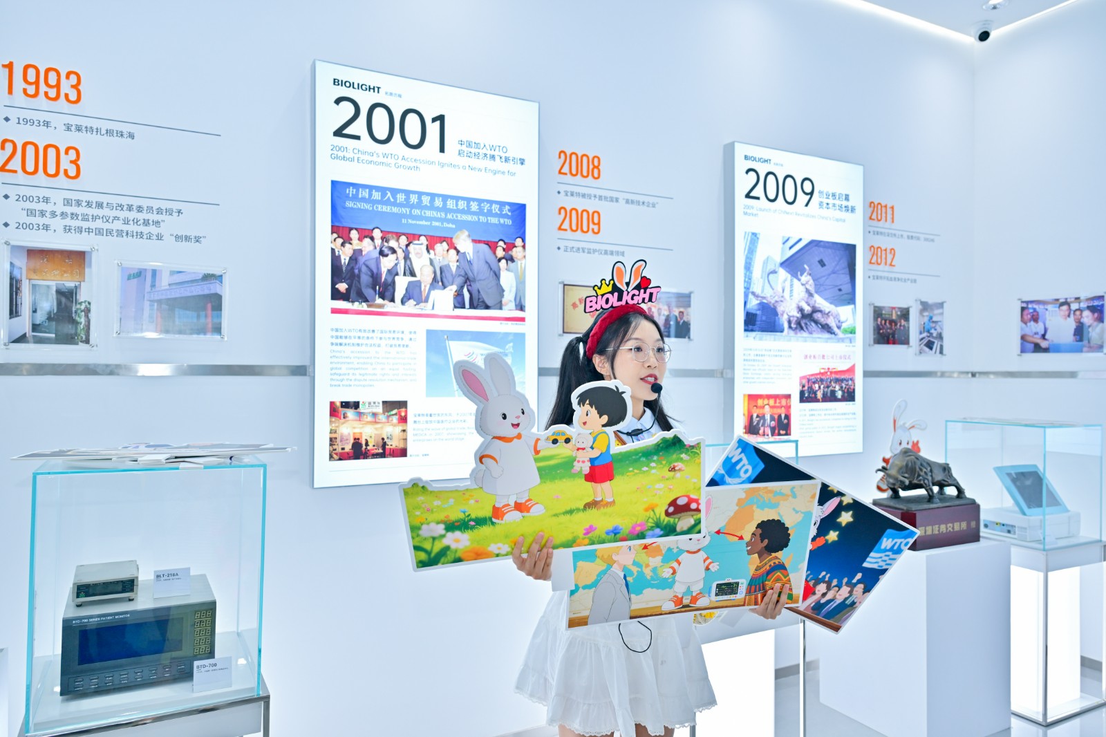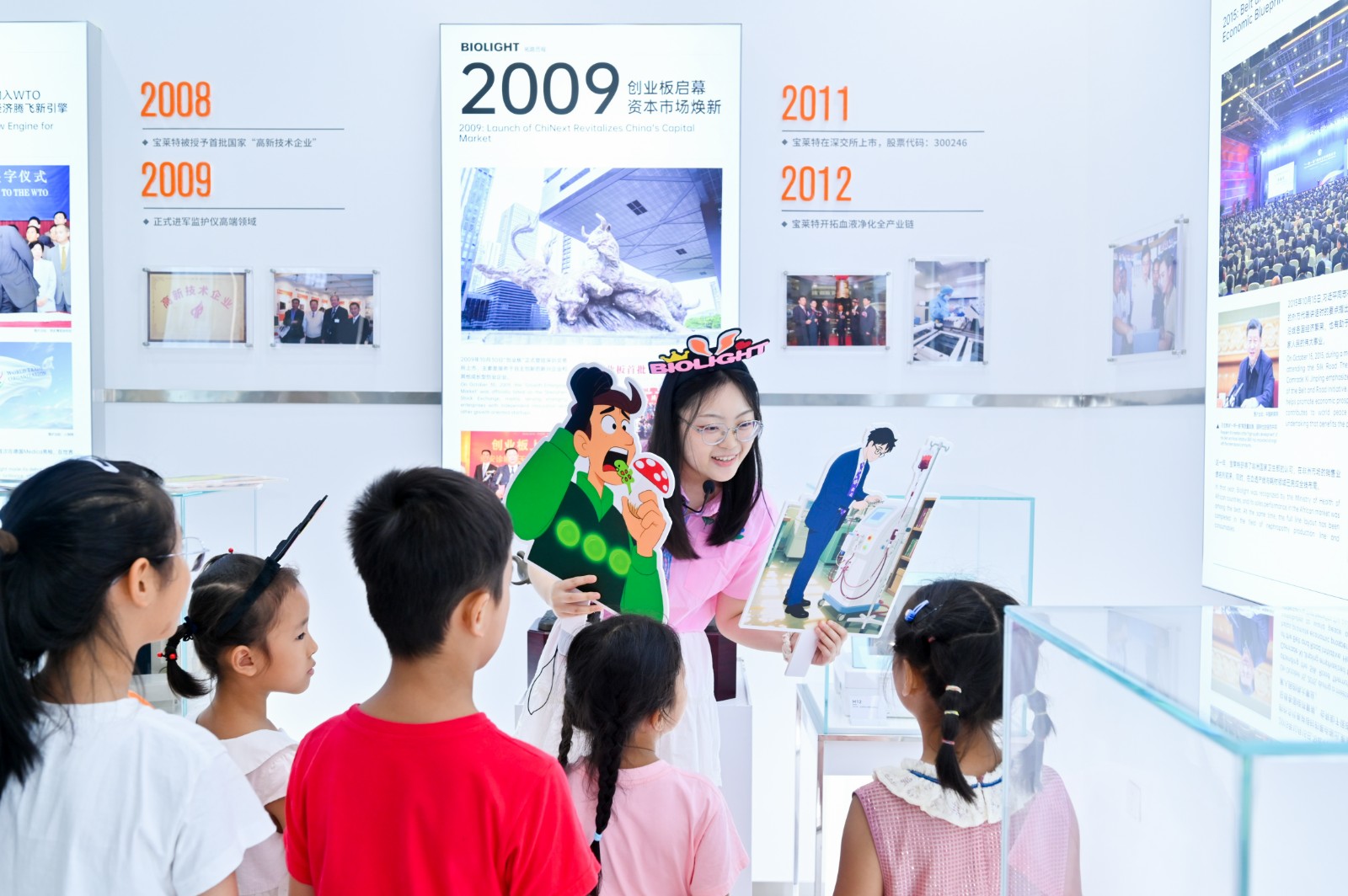 以童趣启智: 兔子姐姐手持 “邓小平南巡”“中国入世”卡通手举牌,将企业史转化为“宝莱兔的时光旅行”。孩子们从LOGO的双手托起生命太阳中读懂守护生命的初心。
